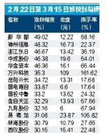 股市中有“三板成妖”一說(shuō)。截至周四收盤,滬深兩市過(guò)去10個(gè)交易日,漲幅超過(guò)30%的股票有34只;過(guò)去5個(gè)交易日,漲幅超過(guò)30%的股票有15只。以上這些股票里,有一些連續(xù)上漲3個(gè)漲停以上,已經(jīng)“成妖”。那么,這些妖股有沒(méi)有一些共同點(diǎn)呢? 除少數(shù)次新股如萬(wàn)興科技之外,絕大多數(shù)這類股票都經(jīng)過(guò)了一兩年下跌,股價(jià)處于低位,因這樣那樣原因得到資金關(guān)注而強(qiáng)力反彈。比如神州信息、浙江東日、中成股份、岳陽(yáng)興長(zhǎng)、國(guó)電南自、國(guó)投中魯、西儀股份等。