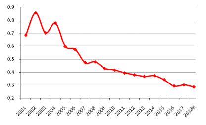 研究發(fā)現(xiàn),貧富差距指數(shù)與經(jīng)濟發(fā)展存在這三個拐點:差異拐點(0.2)、黃金拐點(0.463)及破壞拐點(1)。當貧富差距指數(shù)在0.2以下的低值區(qū)時,絕對平均造成動力不足。當貧富差距指數(shù)高于0.2時,差異的動力效應開始顯現(xiàn),貧富差距指數(shù)與GDP增長率存在顯著的倒U型的非線性關系。而且拐點在貧富差距指數(shù)等于0.463左右,對應的時間為2006-2007年之間,貧富差距在這個水平左右對經(jīng)濟增長的動力效應最高。當貧富差距指數(shù)低于1時,貧富差距處于合理狀態(tài),合理的貧富差距提高了居民的工作動能,有利于促進經(jīng)濟增長,但超過臨界值1,隨著貧富差距進一步提高,貧窮人口會有日益強烈的被剝削感,在一定程度上抑制了經(jīng)濟總量的提升。據(jù)此,近年來我國貧富差距的演變過程可以分為四大階段,分別是“財富絕對平均階段”(1991-2001年)、“差異帶來動力,逐步接近黃金拐點階段”(2001-2007年)、“貧富差異擴大階段”(2007-2015年)及“貧富分化相對嚴重階段”(2015年至今)。經(jīng)研究團隊測算,2018年貧富差距指數(shù)預計已超過破壞拐點。