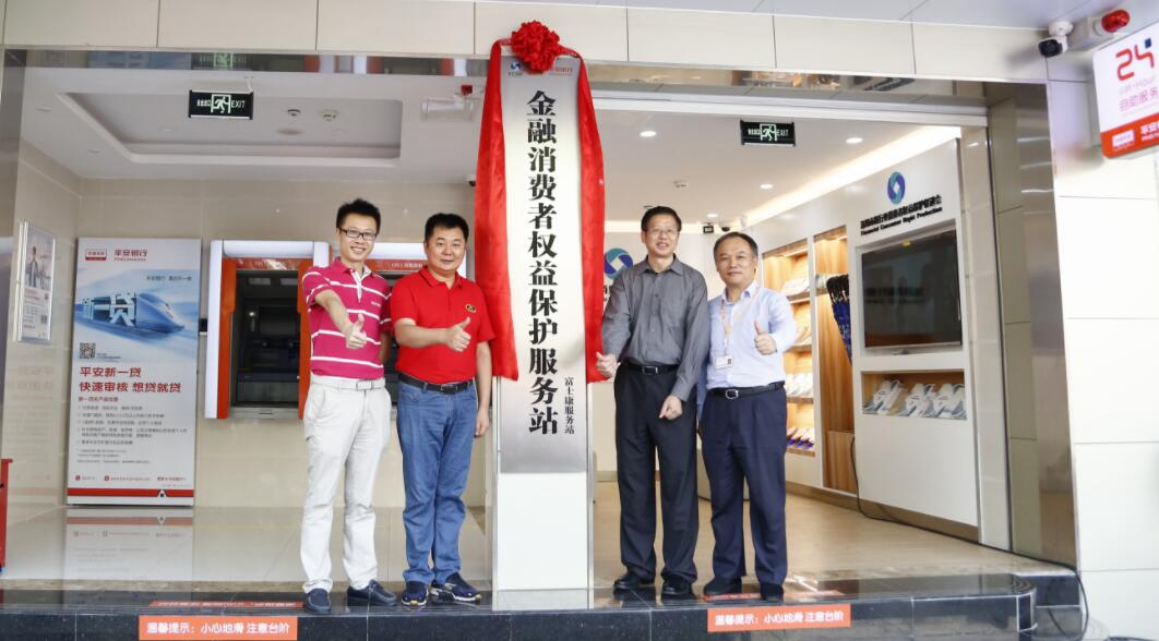 銀保監(jiān)會(huì)督導(dǎo)組領(lǐng)導(dǎo)與深圳銀監(jiān)局消保處葉良才處長(zhǎng)、深圳銀行業(yè)消費(fèi)者權(quán)益保護(hù)促進(jìn)會(huì)尹明生秘書長(zhǎng)、平安銀行深圳分行孫芳滔副行長(zhǎng)以及深圳市公安局反信息詐騙中心、富士康集團(tuán)等相關(guān)領(lǐng)導(dǎo)共同出席了揭牌儀式。