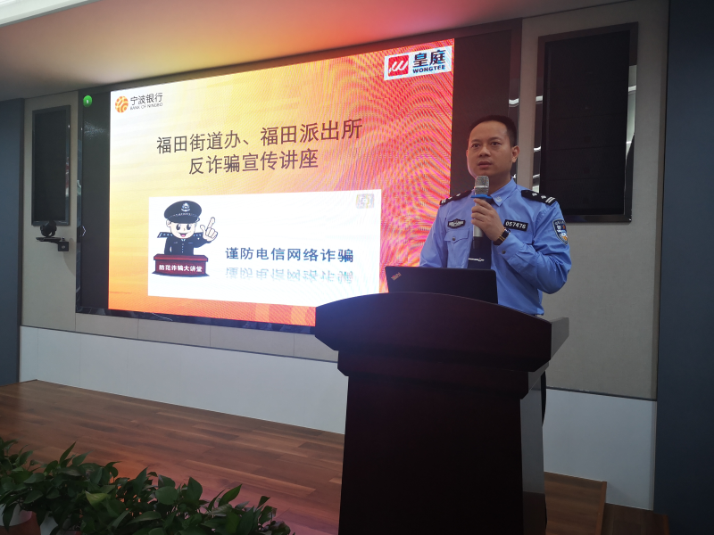 深圳新聞網(wǎng)訊 近年來,信息詐騙案件多發(fā),詐騙分子手段層出不窮,不僅給廣大市民造成了財產(chǎn)損失,更加將社會的反詐騙宣傳教育工作推向重要位置。為了普及廣大金融消費者的反詐騙知識,同時讓知識宣傳更接地氣,近日,寧波銀行深圳分行攜手深圳福田街道辦、福田派出所對皇庭中心大廈100多位商戶代表,開展了一場教育意義深刻的反詐騙知識講座。福田區(qū)副所長羅躍、福田派出所社區(qū)隊隊長莫予寶、福田街道辦政法辦主任馬建忠、皇庭物業(yè)總經(jīng)理吳海兵、寧波銀行深圳分行監(jiān)察保衛(wèi)部副總經(jīng)理陳久桐等9位警銀領導代表出席了本次活動。