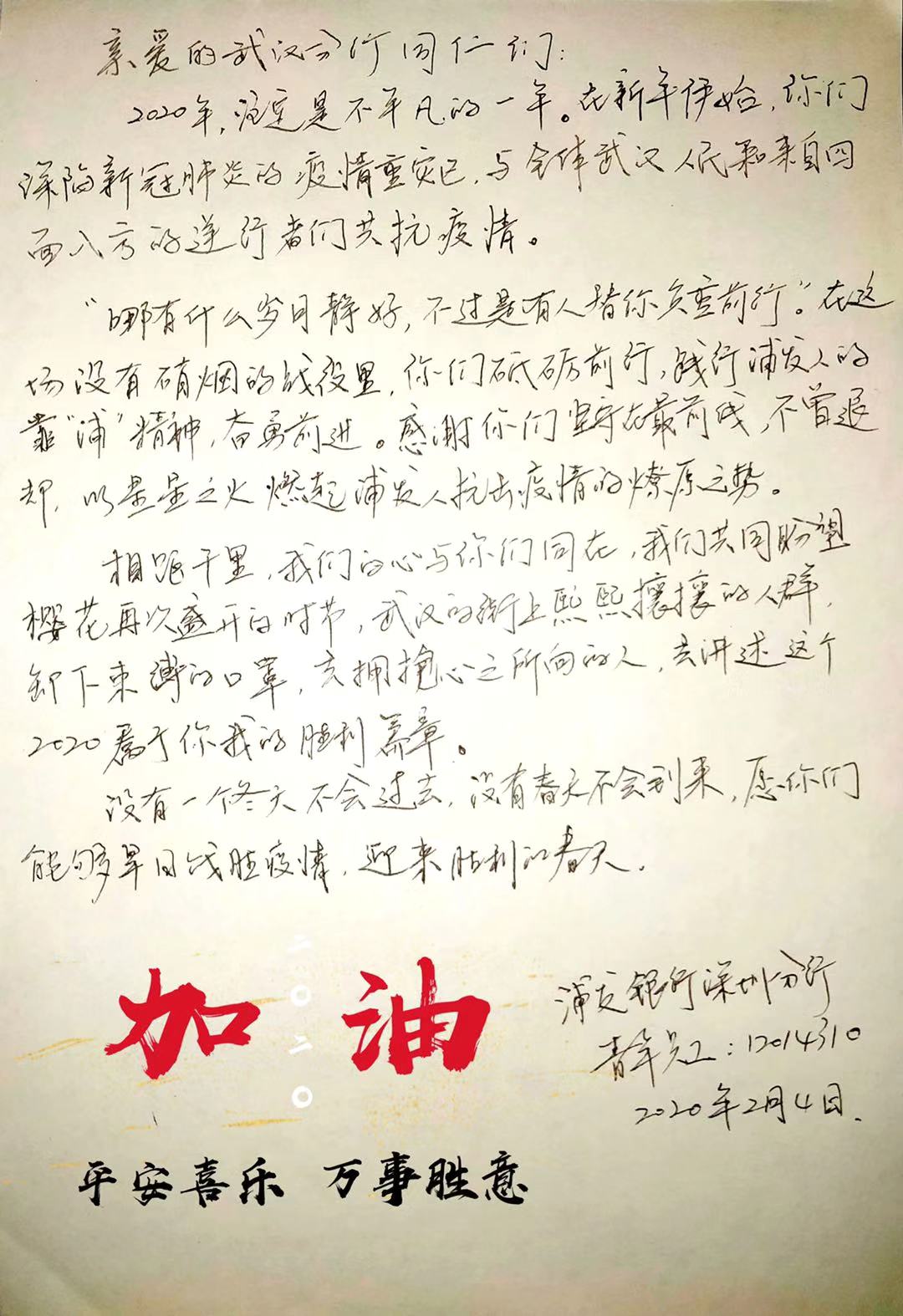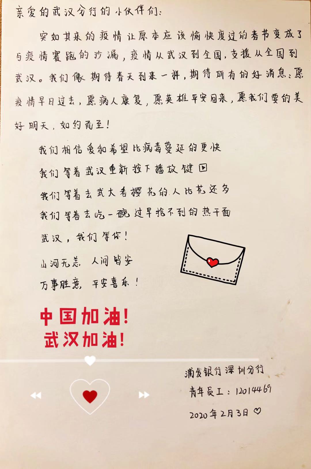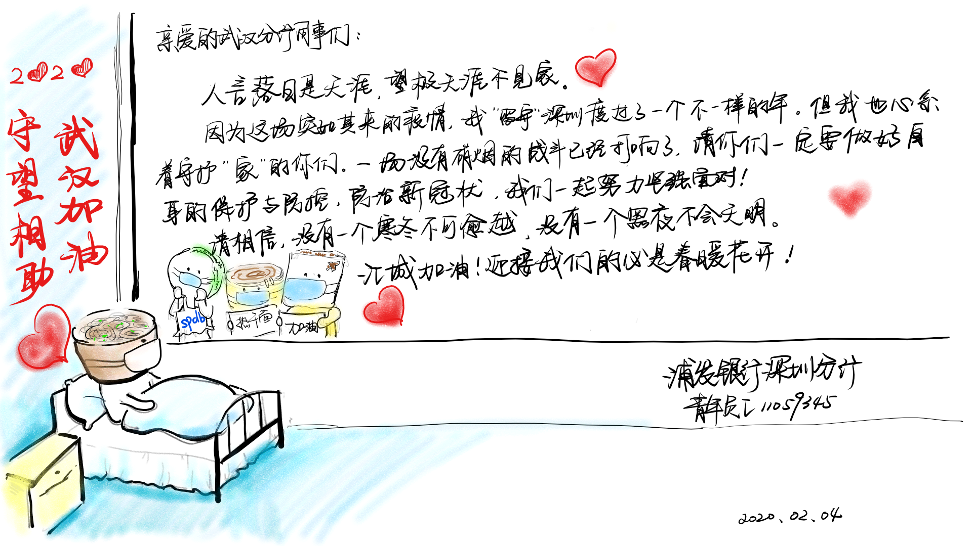 2月3日,浦發(fā)銀行深圳分行團(tuán)委向全體青年員工發(fā)出了一封倡議書。在倡議書中,該行團(tuán)委號(hào)召廣大團(tuán)干部、團(tuán)員青年立即行動(dòng),充分發(fā)揮黨的助手和后備軍作用,展現(xiàn)青年突擊隊(duì)作為,為堅(jiān)決打贏疫情防控阻擊戰(zhàn)貢獻(xiàn)力量,并向青年提出三個(gè)要求:“堅(jiān)定信心不迷茫,聽黨指揮勇?lián)?dāng)”、“科學(xué)防范不信謠,眾志成城控疫情”、“居家辦公不離崗,服從指揮勇?lián)?dāng)”。當(dāng)日,浦發(fā)銀行深圳分行發(fā)起了給武漢分行同事寄送家書的活動(dòng),該行全體青年手寫家書,圖文并茂、紙短情長,表達(dá)了對(duì)疫區(qū)“戰(zhàn)友們”最深切的關(guān)愛和鼓勵(lì),身體力行做好他們堅(jiān)強(qiáng)的后盾。