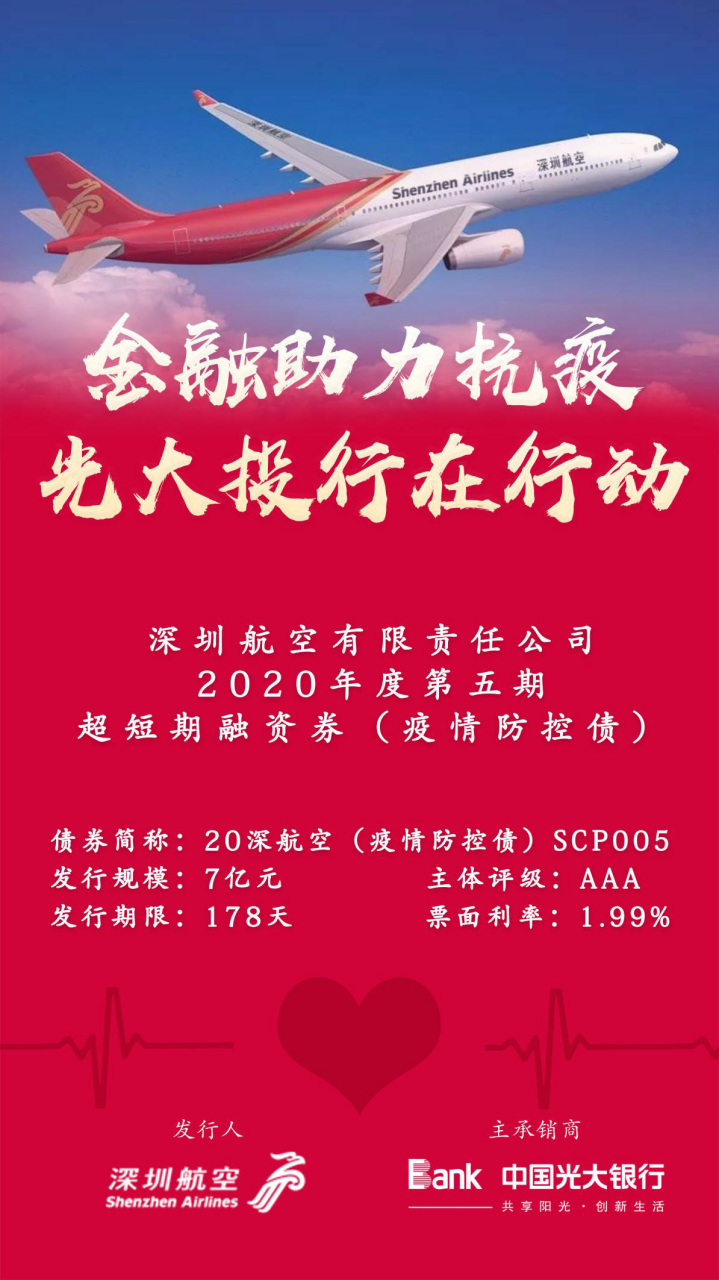 為積極響應(yīng)國家抗疫號(hào)召,支持疫情防控企業(yè)債券融資,光大銀行總行戰(zhàn)投部和深圳分行迅速反應(yīng),堅(jiān)決貫徹落實(shí)光大集團(tuán)及光大銀行總行黨委關(guān)于新型冠狀病毒肺炎疫情防控的有關(guān)要求,于2月11日成功發(fā)行深圳航空有限責(zé)任公司2020年度第五期超短期融資債券(疫情防控債) ,發(fā)行規(guī)模7億元,期限178天,票面利率僅為1.99%。