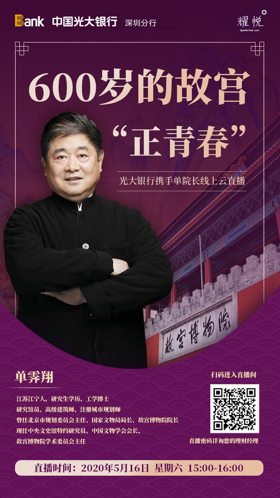 深圳新聞網(wǎng)2020年5月15日訊 他要來了,帶著600歲故宮的青春故事來了,來到《光大銀行“開講啦”!》第十二期。為了回饋客戶,讓廣大客戶更深入體會到故宮之美,光大銀行深圳分行特邀請?jiān)蕦m博物館單霽翔院長,于5月16日(周六)下午3點(diǎn)-4點(diǎn)線上開講精彩課程《600歲的故宮“正青春”》,讓參與者從多個角度體驗(yàn)傳統(tǒng)文化之美。