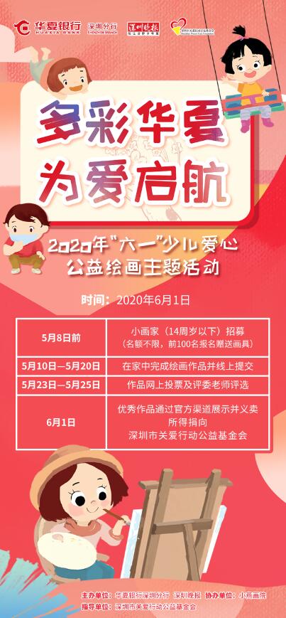 據(jù)了解,該活動(dòng)是由華夏銀行深圳分行攜手深圳晚報(bào)、小燕畫(huà)院開(kāi)展的“多彩華夏為愛(ài)啟航”少兒愛(ài)心公益繪畫(huà)。活動(dòng)向深圳市民招募小畫(huà)家,邀請(qǐng)他們用手中畫(huà)筆描繪精彩世界。同時(shí),將繪畫(huà)賦予公益與愛(ài)心,評(píng)選出部分優(yōu)秀作品進(jìn)行線(xiàn)上義賣(mài),以點(diǎn)亮地貧兒童的生命之光。