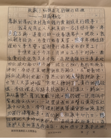 “事發(fā)第二天,該行行長(zhǎng)又派陳學(xué)年、李美芳兩位員工到我家探望、慰問(wèn),讓我全家非常感動(dòng)?!?月29日下午,傷口剛剛拆線的老人就帶著手寫的感謝信來(lái)到深圳農(nóng)商行黃閣坑支行,向幫助過(guò)他的兩位熱心人表達(dá)感謝之情。感謝信整整三頁(yè)紙,字跡工整,老人家的誠(chéng)摯感謝之意躍然紙上。