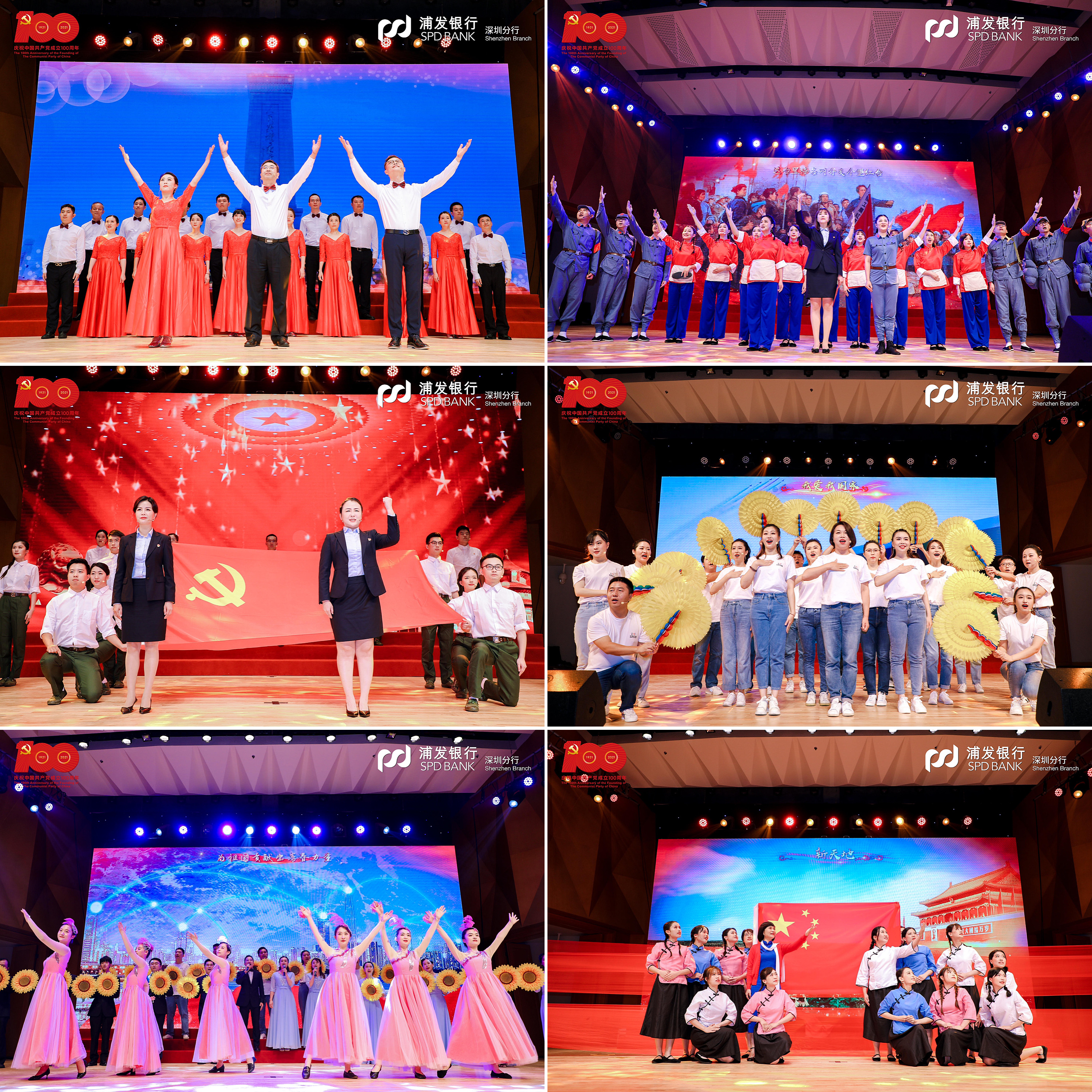 在黨支部風(fēng)采展示環(huán)節(jié),該行基層黨支部精心編排12首紅色經(jīng)典,通過4個(gè)篇章再現(xiàn)百年波瀾壯闊的偉大歷程。第一篇章“開天辟地”演繹了中國(guó)共產(chǎn)黨在新民民主義革命時(shí)期完成救國(guó)大業(yè)的輝煌歷程,《保衛(wèi)黃河》吹響了高亢嘹亮的愛國(guó)號(hào)角,《十送紅軍》深情演繹血濃于水軍民情,《繡紅旗》一腔熱血帶著大家重回歌樂山。第二篇章“改天換地”回顧了中國(guó)共產(chǎn)黨在社會(huì)主義革命和建設(shè)時(shí)期完成興國(guó)大業(yè)的奮斗史詩(shī),《歌唱祖國(guó)》撥動(dòng)人們最難忘的記憶,《我們走在大路上》展現(xiàn)當(dāng)年敢闖敢拼的奮進(jìn)之姿態(tài),《唱支山歌給黨聽》唱出人民心中永恒的贊歌。第三篇章“翻天覆地”再現(xiàn)了中國(guó)共產(chǎn)黨在改革開放和社會(huì)主義現(xiàn)代化建設(shè)新時(shí)期推進(jìn)富國(guó)大業(yè)的光榮壯舉,《在燦爛陽(yáng)光下》重現(xiàn)春風(fēng)化雨之后的奮斗時(shí)光,《國(guó)家》打動(dòng)多少人的赤子之心,《我們的生活充滿陽(yáng)光》訴說了改革開放背后的喜悅。第四篇章“驚天動(dòng)地”展現(xiàn)了中國(guó)共產(chǎn)黨在中國(guó)特色社會(huì)主義新時(shí)代推進(jìn)并將在本世紀(jì)中葉實(shí)現(xiàn)強(qiáng)國(guó)大業(yè)的偉大時(shí)代,一首《天耀中華》是浦發(fā)人最深沉的表達(dá),《燈火里的中國(guó)》讓人漫步燈火漫卷的萬里山河,《再一次出發(fā)》展示浦發(fā)追夢(mèng)者的雄姿英發(fā)。走過“百年風(fēng)雨”,浦發(fā)銀行深圳分行合唱團(tuán)一首《我和我的祖國(guó)》,蓬勃朝氣盡顯拳拳愛國(guó)心、濃濃赤子情。篇章結(jié)束,大家全體起立,高聲合唱《沒有共產(chǎn)黨就沒有新中國(guó)》,以最真摯最熱烈的歌聲獻(xiàn)禮建黨百年。