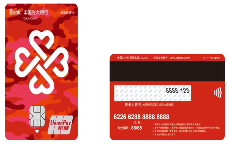 在金融服務(wù)產(chǎn)品方面,光大銀行面向軍人、退役軍人發(fā)行“擁軍優(yōu)撫”專屬聯(lián)名卡,優(yōu)撫對象可以憑軍官證、士兵證、退役證等有效證件在該行營業(yè)網(wǎng)點(diǎn)柜臺辦理賬戶開立并免收卡片工本費(fèi),“擁軍優(yōu)撫”專屬銀行卡在全國統(tǒng)一實(shí)現(xiàn)兩個(gè)專屬服務(wù)和十項(xiàng)優(yōu)惠政策。