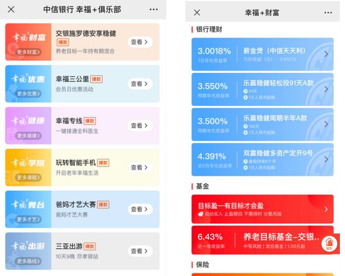 中信銀行“幸福+俱樂(lè)部”“幸福+財(cái)富”頁(yè)面展示