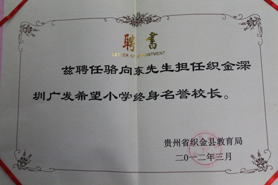 2013年,在駱向東的退休儀式上,織金縣教育局將一張希望小學(xué)終身名譽(yù)校長的聘書,鄭重交到了他的手上?!拔液軜s幸能代表廣發(fā)銀行深圳分行黨委去推動這件事,但公益事業(yè)任重道遠(yuǎn),我相信愛心基因會在廣發(fā)一直傳承下去?!笔聦嵰舱珩樝驏|所言,從1998年籌建希望小學(xué)至今,一代代廣發(fā)人身體力行,讓愛心助學(xué)一棒接力一棒。