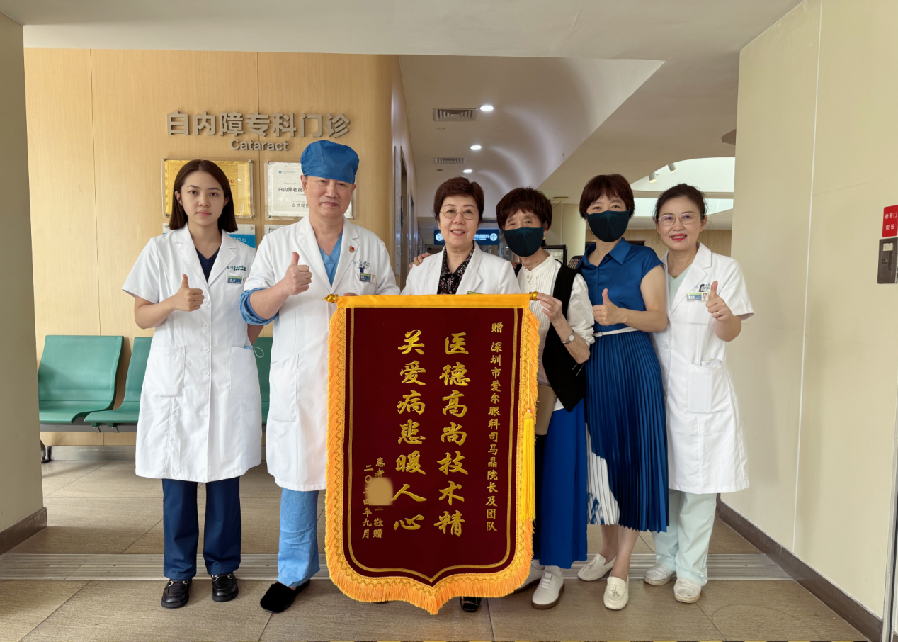 完成手術(shù)的劉奶奶心情無比輕松,坐在輪椅上被推出手術(shù)室時,她向醫(yī)護人員豎起了大拇指。兩天后,劉奶奶又順利進行了另一只眼的手術(shù)。通過飛秒激光輔助白內(nèi)障手術(shù),一次性解決了她的白內(nèi)障、遠視、散光及老視等多種眼病困擾。術(shù)后,她為醫(yī)護人員送來錦旗,激動地抱著司馬晶教授道謝:“感謝您治好了我的眼睛,我現(xiàn)在看遠看近都很清楚,真后悔沒有早點做這個手術(shù)!”