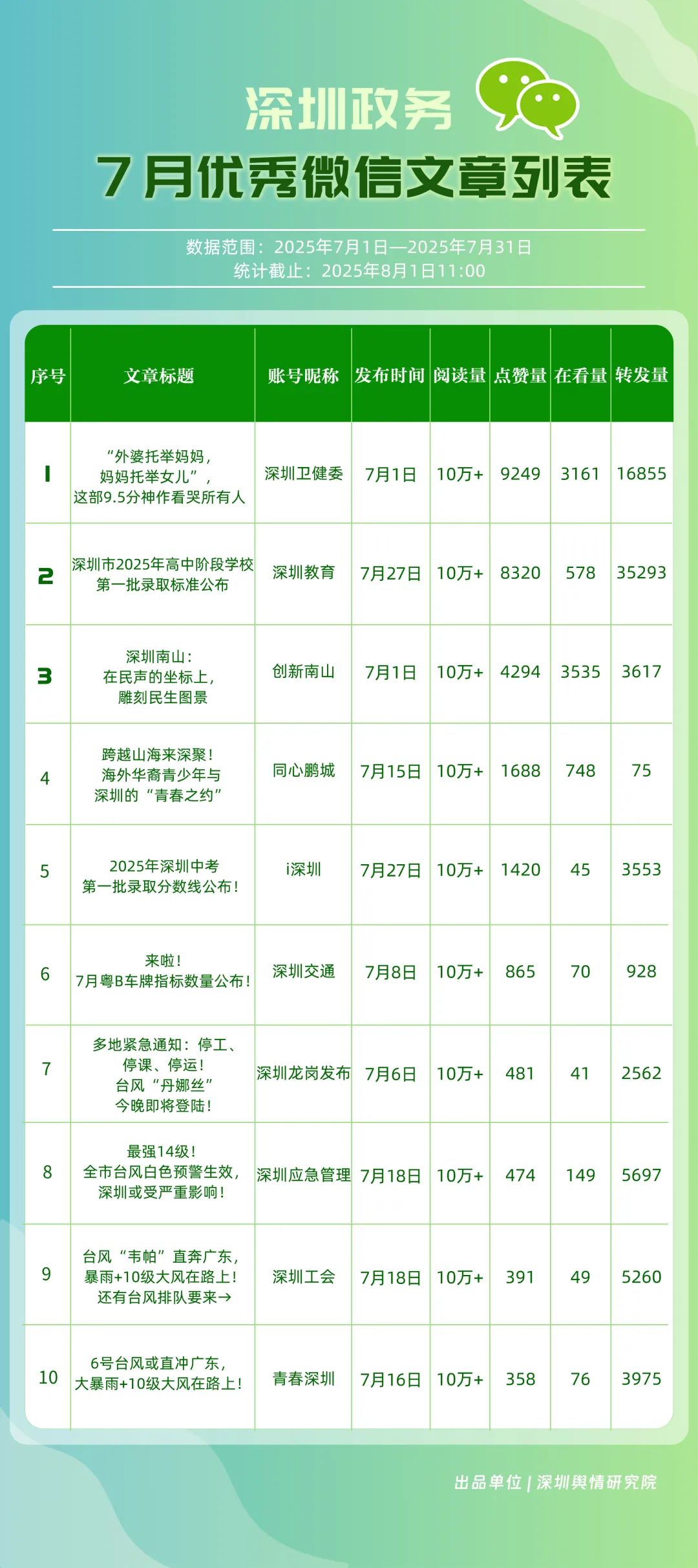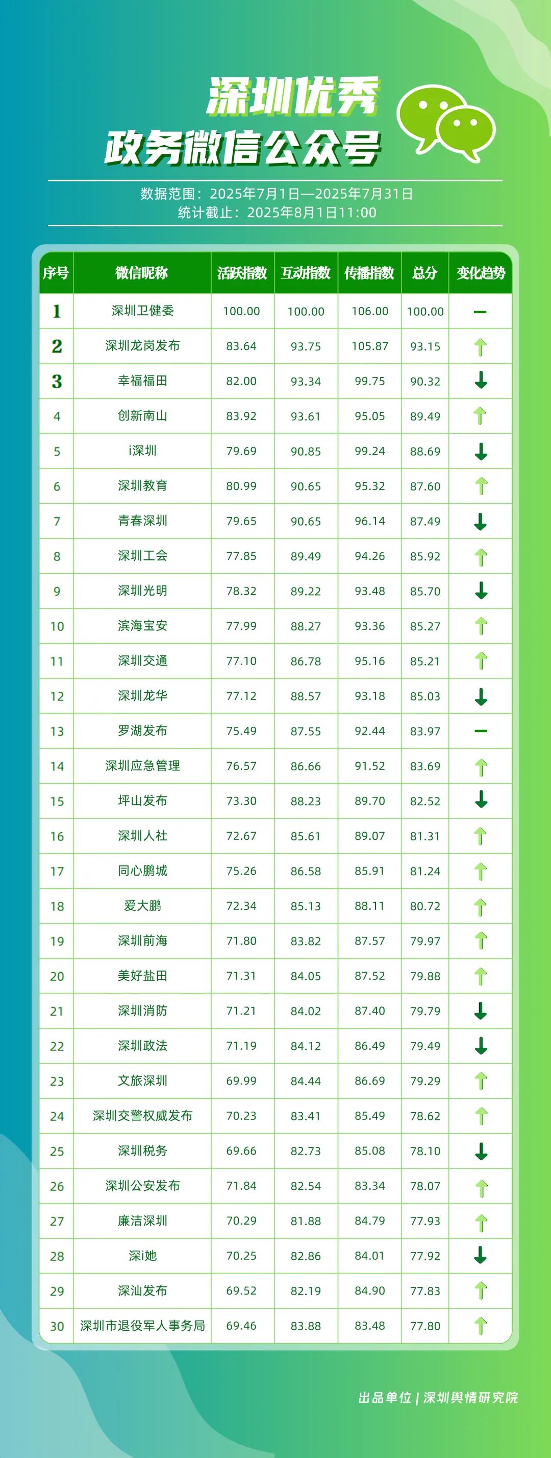 7月,30個(gè)政務(wù)微信公眾號(hào)入選“深圳優(yōu)秀政務(wù)微信公眾號(hào)”榜單,其中包括“深圳衛(wèi)健委”“深圳龍崗發(fā)布”“幸福福田”“創(chuàng)新南山”“i深圳”“深圳教育”“青春深圳”“深圳工會(huì)”“深圳光明”“濱海寶安”等。7月,“深圳衛(wèi)健委”內(nèi)容專業(yè)性與傳播力優(yōu)勢(shì)穩(wěn)固,整體表現(xiàn)保持較高水平,位于榜首;“深圳龍崗發(fā)布”聚焦民生服務(wù)與區(qū)域活動(dòng)宣傳,實(shí)現(xiàn)傳播效果提升,位居第二;“幸福福田”表現(xiàn)同樣不俗,排名第三?!皠?chuàng)新南山”“深圳教育”“深圳工會(huì)”等也積極發(fā)布高質(zhì)量信息與服務(wù)內(nèi)容,能夠較好平衡內(nèi)容“質(zhì)”與“量”,排名有所提升。上榜微信公眾號(hào)依托特色優(yōu)勢(shì)深耕內(nèi)容創(chuàng)作,將優(yōu)質(zhì)內(nèi)容作為核心支撐,成為政務(wù)傳播領(lǐng)域的優(yōu)秀典范。