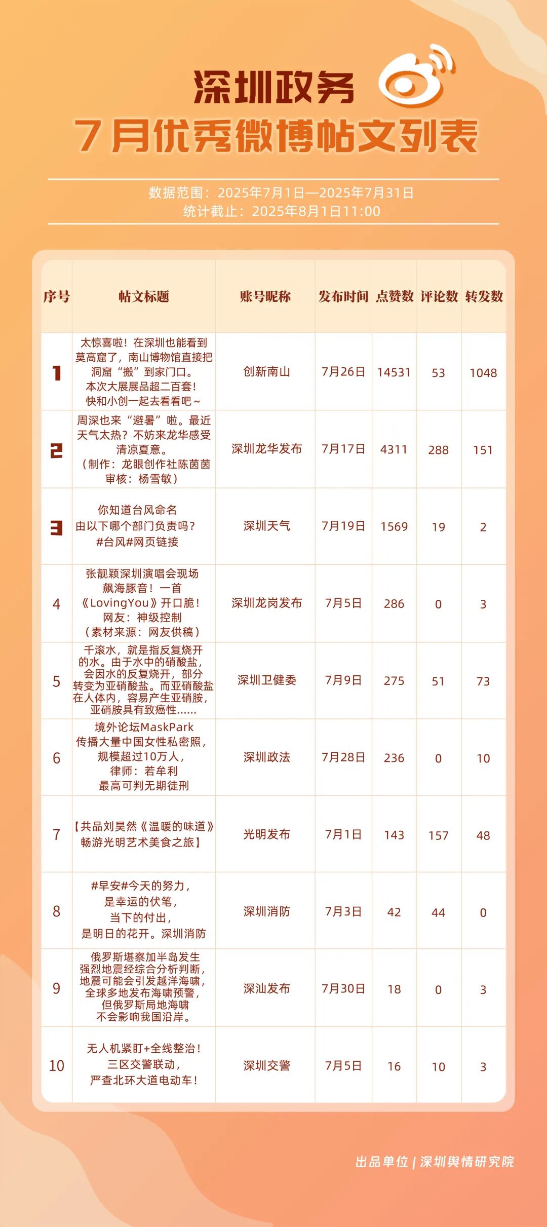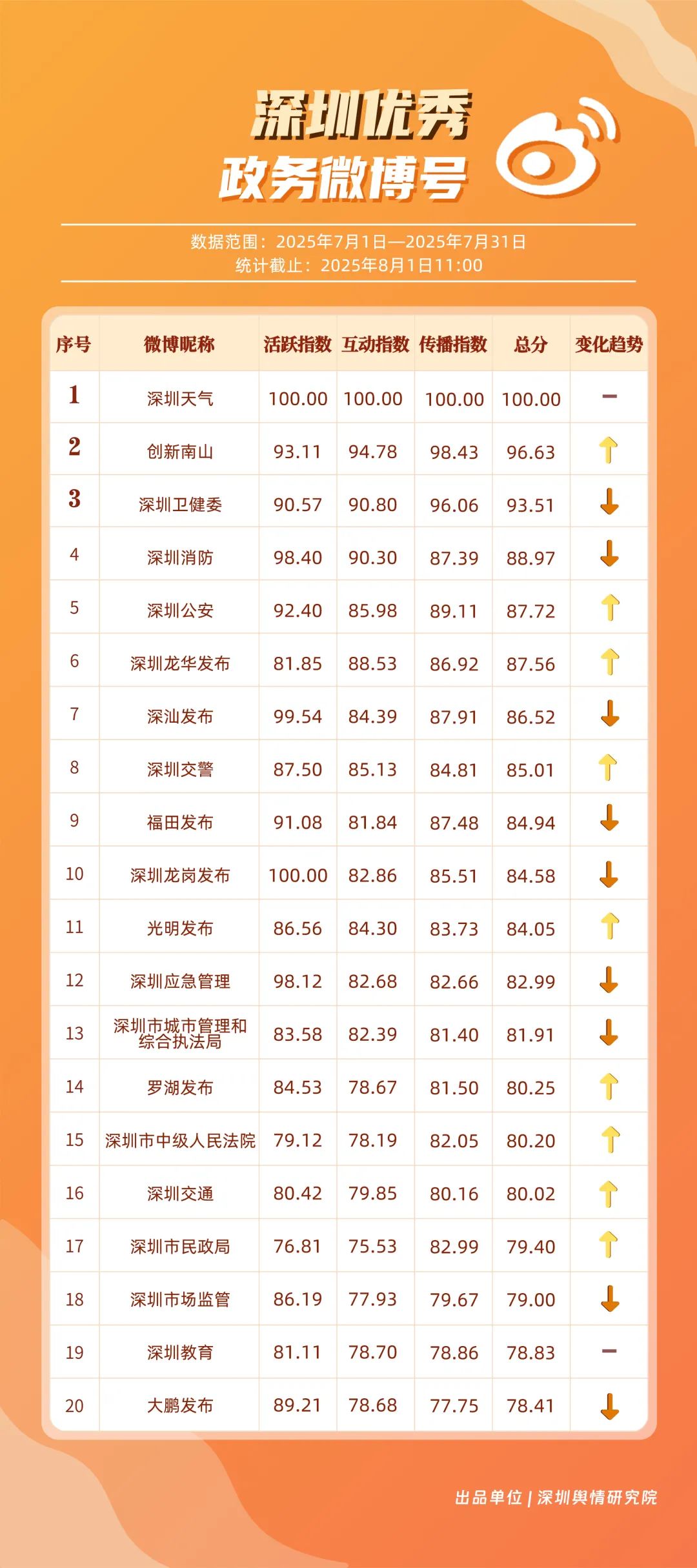 7月,“深圳天氣”“創(chuàng)新南山”“深圳衛(wèi)健委”“深圳消防”“深圳公安”“深圳龍華發(fā)布”“深汕發(fā)布”“深圳交警”“福田發(fā)布”“深圳龍崗發(fā)布”等20個(gè)賬號(hào)入選“優(yōu)秀政務(wù)微博號(hào)”。其中,“深圳天氣”以活躍、互動(dòng)、傳播指數(shù)三項(xiàng)滿分,蟬聯(lián)榜首;“創(chuàng)新南山”以總分96.63躍居第二,排名呈上升趨勢(shì);“深圳衛(wèi)健委”位列第三,評(píng)分也在90分以上,其科普信息持續(xù)獲得市民廣泛認(rèn)可。以上優(yōu)秀的政務(wù)微博賬號(hào)精準(zhǔn)貼合平臺(tái)的傳播規(guī)律,用獨(dú)特的賬號(hào)風(fēng)格展現(xiàn)各自特色與魅力。