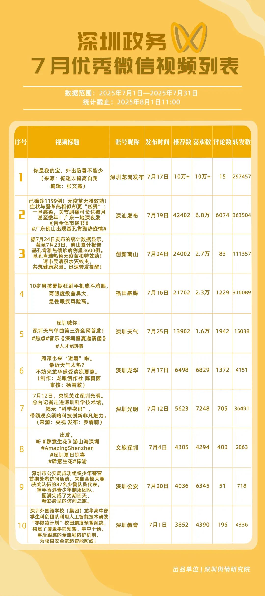 7月,“深圳天氣”“DOU愛龍華”“深圳魅力福田”“深汕發(fā)布”“掌上龍崗”“創(chuàng)新南山”“深圳交警”“文旅深圳”“深圳衛(wèi)健委”“深圳普法”共10個(gè)政務(wù)抖音號(hào)獲得“優(yōu)秀政務(wù)抖音號(hào)”稱號(hào)。其中,“深圳天氣”互動(dòng)指標(biāo)獲滿分,憑借氣象與趣味相結(jié)合的創(chuàng)新科普形式,領(lǐng)跑優(yōu)秀政務(wù)抖音號(hào);“DOU愛龍華”“深圳魅力福田”分別位列第二、三名,通過聚焦網(wǎng)絡(luò)熱點(diǎn)、挖掘創(chuàng)意內(nèi)容,不斷提升傳播效能,展現(xiàn)出強(qiáng)大的政務(wù)新媒體影響力;“深汕發(fā)布”“掌上龍崗”“創(chuàng)新南山”等賬號(hào)緊隨其后,上榜的優(yōu)質(zhì)政務(wù)抖音號(hào)用短視頻語言強(qiáng)化傳播效果,展現(xiàn)了鮮明的賬號(hào)特色和風(fēng)采。