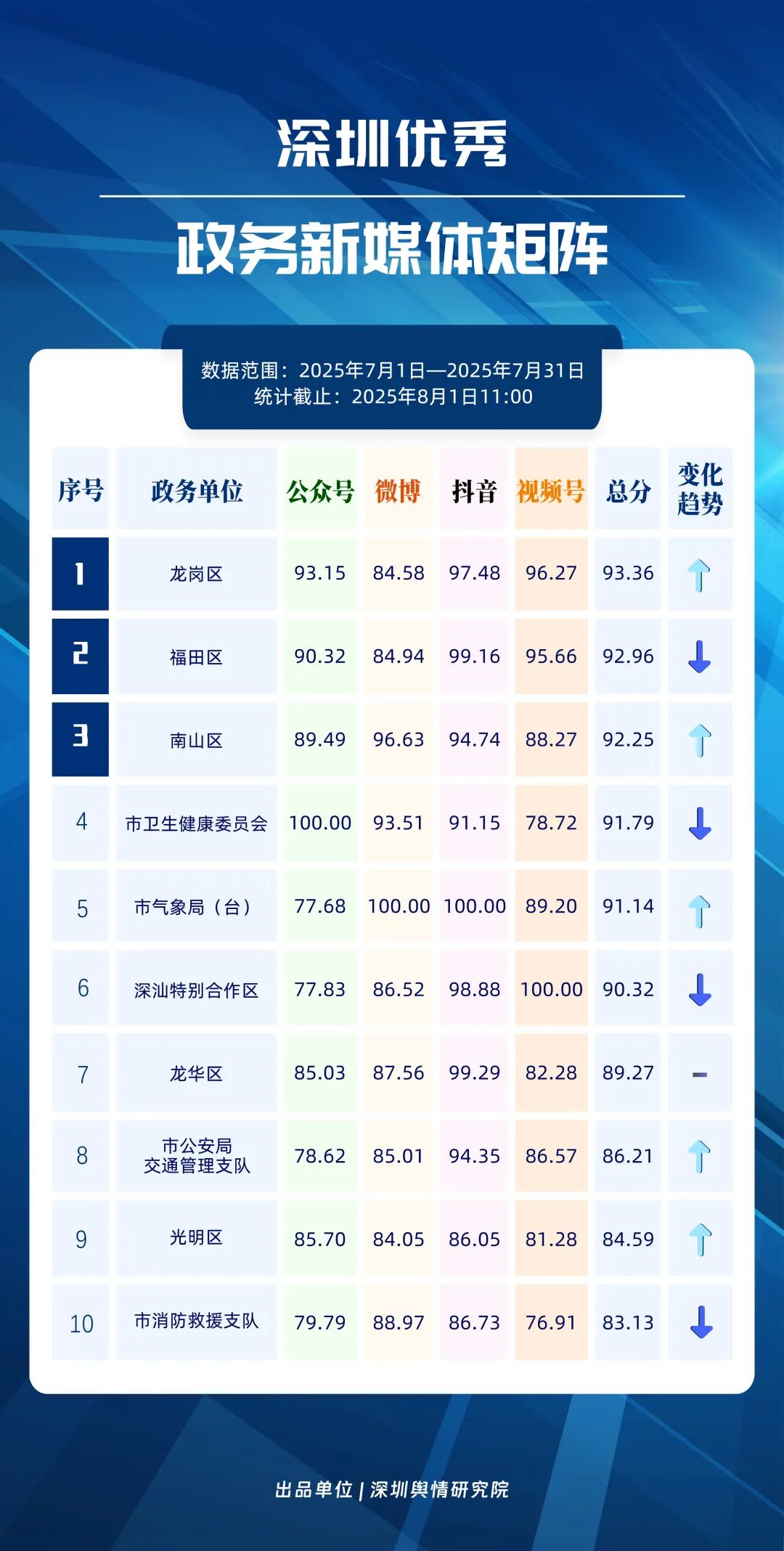 7月,深圳政務(wù)新媒體矩陣各展所長(zhǎng),為市民帶來豐富實(shí)用的信息服務(wù)。龍崗區(qū)、福田區(qū)、南山區(qū)、市衛(wèi)生健康委員會(huì)、市氣象局(臺(tái))、深汕特別合作區(qū)、龍華區(qū)、市公安局交通管理支隊(duì)、光明區(qū)、市消防救援支隊(duì)的新媒體矩陣入選“深圳優(yōu)秀政務(wù)新媒體矩陣”榜單。值得關(guān)注的是,龍崗區(qū)新媒體矩陣在7月著力提升內(nèi)容質(zhì)量,于抖音和微信視頻號(hào)平臺(tái)得分顯著提高,成功登頂;福田區(qū)新媒體矩陣在抖音平臺(tái)表現(xiàn)突出,位列榜單第二;南山區(qū)新媒體矩陣則在微博和抖音平臺(tái)保持評(píng)分優(yōu)勢(shì)。此外,市氣象局(臺(tái))、市公安局交通管理支隊(duì)和光明區(qū)的排名也實(shí)現(xiàn)明顯上升,體現(xiàn)出政務(wù)新媒體矩陣整體競(jìng)爭(zhēng)力持續(xù)增強(qiáng)。