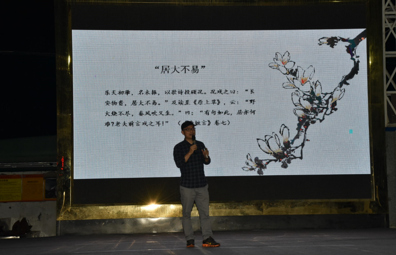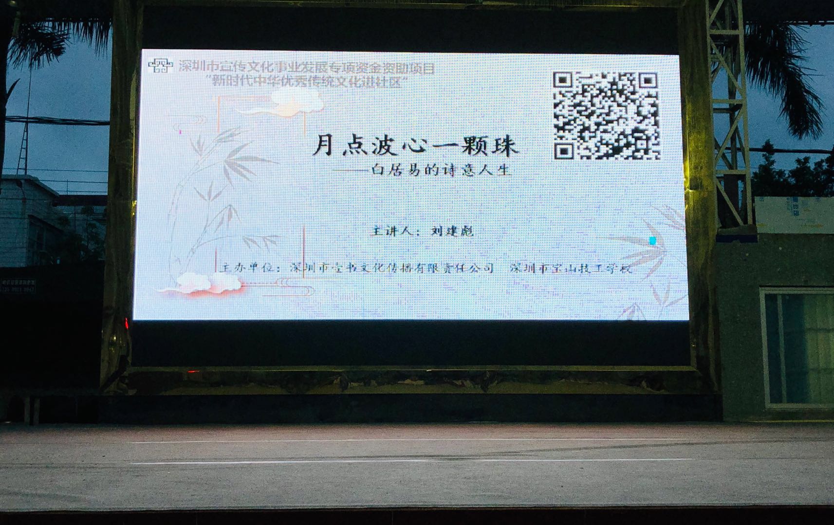 5月29日晚上,“新時代中華優(yōu)秀傳統(tǒng)文化進社區(qū)”系列活動第三場公益文化講座之“月點波心一顆珠——白居易的詩意人生”在深圳市寶山技工學校寶山大舞臺拉開帷幕。