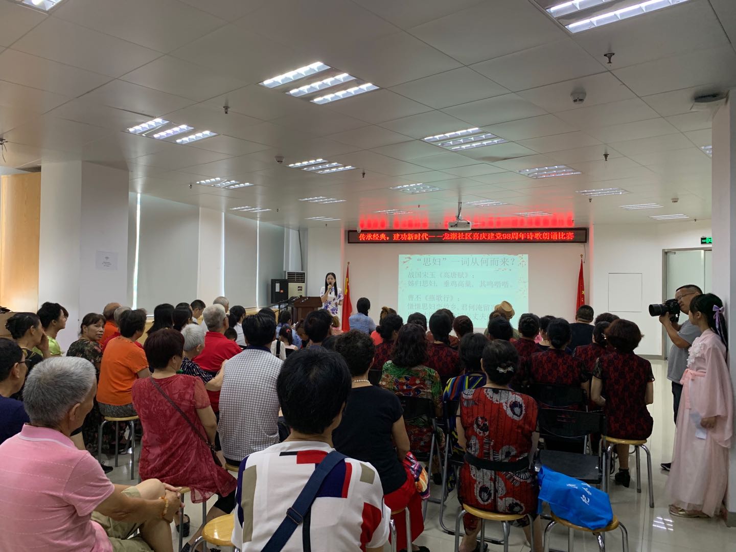 講座開始前,龍湖社區(qū)古詩新韻班的學(xué)員傾情奉上國學(xué)經(jīng)典新學(xué)堂歌——《游子吟》,為本次活動拉開了序幕。接著,龍湖社區(qū)的羅黎靜書記深情致辭,為“新時代中華優(yōu)秀傳統(tǒng)文化”項目走進(jìn)社區(qū)表示榮幸和歡迎,“人生自有詩意,詩意美在四季。今天來到現(xiàn)場的每一個人都心中有愛,腹中有詩,對生命有著詩一般的向往和追求”,喚醒生命中的詩意,活動的意義也在于此。
