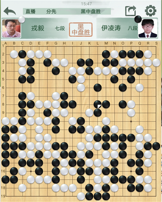 第三臺,戎毅執(zhí)白對陣伊凌濤。開局白棋不錯,左側沖擊黑棋薄弱處時候次序失誤,
