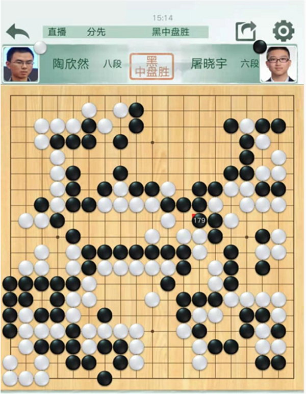 第三臺(tái),陶欣然執(zhí)白負(fù)屠曉宇。開局左下角形成流行的大型變化,結(jié)果大致兩分局面。右上角黑棋103行棋次序失誤,但是白棋106沒有把握住在黑空里面斷一個(gè)出棋的好機(jī)會(huì)之后,黑稍好。白中央114與黑互相破空急躁,導(dǎo)致局面惡化。最終白棋破釜沉舟選擇舍棄中央殺黑右下角,轉(zhuǎn)換后依然白棋敗勢(shì)遂認(rèn)負(fù)。