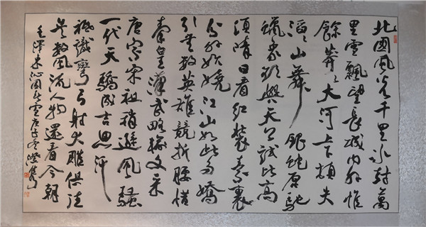 活動(dòng)開始前,與會(huì)嘉賓在服務(wù)人員的引導(dǎo)下參觀了《毛澤東詩詞主題書法展》。展廳布置的作品有40余幅,全部內(nèi)容均為毛澤東同志在革命活動(dòng)所創(chuàng)作的詩詞,或整篇書寫,或取其意。作品形式以橫幅、斗方、條幅、對(duì)聯(lián)為主,字體多為行草,間有楷書隸書,書寫者有企事單位的領(lǐng)導(dǎo)、干部和離退休人員。在這個(gè)特殊的日子里,他們以此形式緬懷毛主席的豐功偉績,表達(dá)內(nèi)心對(duì)毛澤東同志的敬意和懷念。