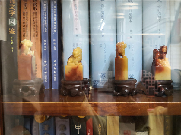 書房約莫20平米不到,擺設(shè)裝點里透射出寧老師的日常。當(dāng)陽光照進(jìn)這間寧靜的小屋,他習(xí)慣于先打開音樂,在舒心樂聲中開始他一天讀書、刻印的生活。累了,在小桌上喝喝茶,或彈上一段古琴,或者玩賞一下他收藏的心愛鈴鐺。據(jù)介紹,他專門收藏西北一帶富貴人家的馬鈴,目前有100余個。寧老師說,“讀書、養(yǎng)性、積德、延年”是其志向,井井有條、一絲不茍的書房就是佐證。長期的濡養(yǎng),讓人感到寧老師的談吐從容、情趣高雅、思想深刻。映照在篆刻上,寧老師的印作也日漸沉穩(wěn)大氣,除姓名印章外,所刻內(nèi)容啟人心智,如“以正大立心”“以光明行事”“修辭立其誠”等等。