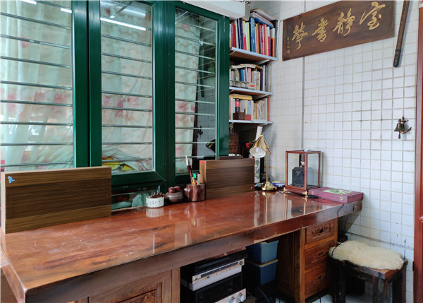 俗話說得好:見識一個素養(yǎng),看看他的書房就知道了!那么,寧起興老師的書房是什么樣的呢?第一印象:簡潔、古樸、有趣味。一眼掃去,臨窗一張紅木桌,兩個裝得滿滿的老書柜,兩張烏黑發(fā)亮的南官帽椅,中間配有一張老舊的喝茶的原木桌,正上方的墻面掛著一整張大大的南美阿根廷牛皮。墻上橫掃,掛有“室靜書馨”的書法作品,一張古琴,一把薩克斯,幾份有關(guān)他篆刻宣傳的剪報,還有星星點點的各類鈴鐺。細(xì)看呢:書柜里的篆刻工具書,有大部頭的字典、印譜和系列叢書,也有與篆刻相關(guān)的文化類書籍,大多插滿了顏色各異的標(biāo)簽,可見寧老師讀書的細(xì)致與用心。紅木大桌上有一對大音箱,是原裝進(jìn)口的德國貨;桌子旁,有一正方形的小桌特別顯眼,寧老師帶著些許自豪的神態(tài)介紹說,鉗臺是德國進(jìn)口的,鋸子也是原裝進(jìn)口的,那個刻銅印的印盤是定制的。還有,他所用的刻刀頂端印有l(wèi)ogo,是小篆“寧”字與工字的合寫,該刀鋼材鈷含量為17%,也是定制的。正所謂“工欲善其事,必先利其器”,寧老師深以為然。是以,他在工具上追求“高精尖”甚至不惜工本。