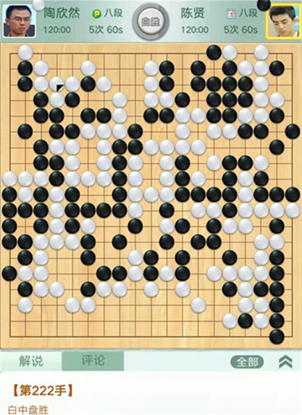 今日比賽中,申旻俊主將執(zhí)黑對陣新二冠羋昱廷,開局左上角申旻俊配合小米使出羋氏飛刀,結(jié)果是飛刀不成功黑棋局面領(lǐng)先。中盤黑棋攻擊中央白棋時,白棋脫先搶占實地。被黑手起刀落斬殺大龍,局終??炱迮_,去年屢立戰(zhàn)功的戎毅七段執(zhí)白對陣黃云嵩七段,行棋穩(wěn)健,占居三個角之后,又在中間活出一大塊,行棋至194手勝。三臺陶欣然八段對陣陳賢八段,行棋222手白中盤勝。四臺時越九段對趙晨宇一戰(zhàn),行至284手,以四分之三子微弱優(yōu)勢取勝。