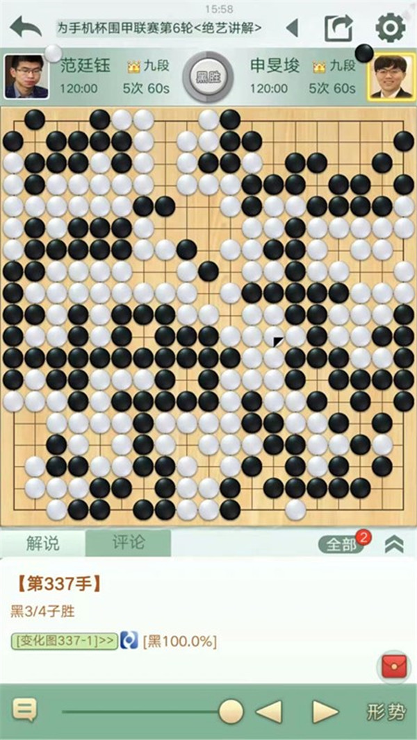 一臺申旻俊執(zhí)黑對陣世界冠軍范廷鈺。開局下邊白棋攻擊手法不當(dāng),黑處理好后局面領(lǐng)先。中盤黑棋在左邊計算精準(zhǔn),下出絕妙手段,在白棋空里出棋后優(yōu)勢擴(kuò)大,之后黑棋穩(wěn)扎穩(wěn)打?qū)?yōu)勢保持至終局獲勝。