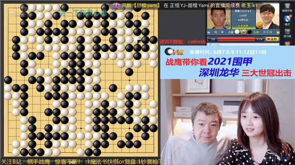 今日大局好,教練羅洗河心情自然好。于是興高采烈地去虎牙直播和戰(zhàn)鷹侃棋了。戰(zhàn)鷹是職業(yè)二段,女子圍甲主力選手,人美、棋強、口才好,虎牙直播間圍棋知名主播,是深圳龍華隊網(wǎng)上直播合作人。深圳龍華隊后續(xù)比賽將持續(xù)在虎牙平臺直播,歡迎大家關注哦!