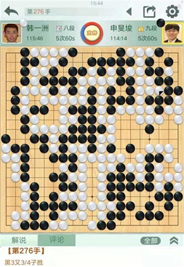 申旻俊主將執(zhí)黑對陣小將韓一洲,布局局面接近。進入中后盤后,白方明顯功力不足,小失誤不斷。黑棋優(yōu)勢逐漸擴大,最終以較大差距獲勝。