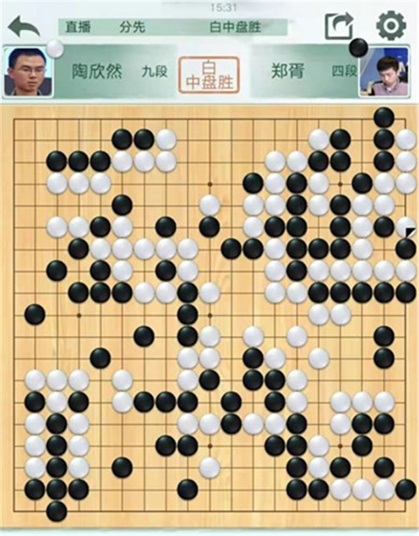 陶欣然執(zhí)白對陣小將鄭胥。黑棋開局在左邊虧損,局面落后。最后黑棋在右邊破釜沉舟尋求戰(zhàn)機,白棋計算精準,將黑全殺,白中盤勝。
