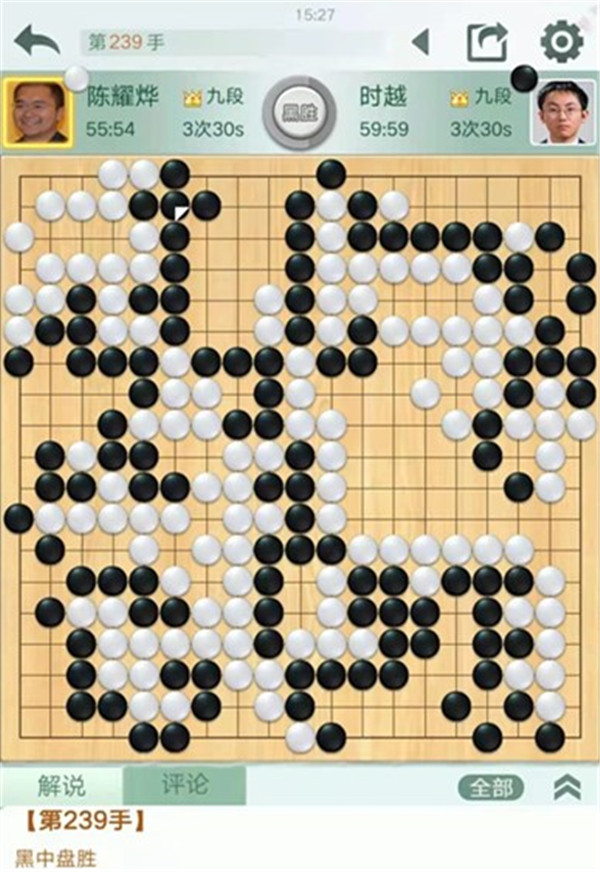 時越快棋執(zhí)黑對陣世界冠軍陳耀燁。中盤黑棋在右邊白勢中試應手,白棋應對松緩,被黑棋先手便宜十幾目棋,黑局面領先。之后黑棋行棋嚴謹,中盤獲勝。