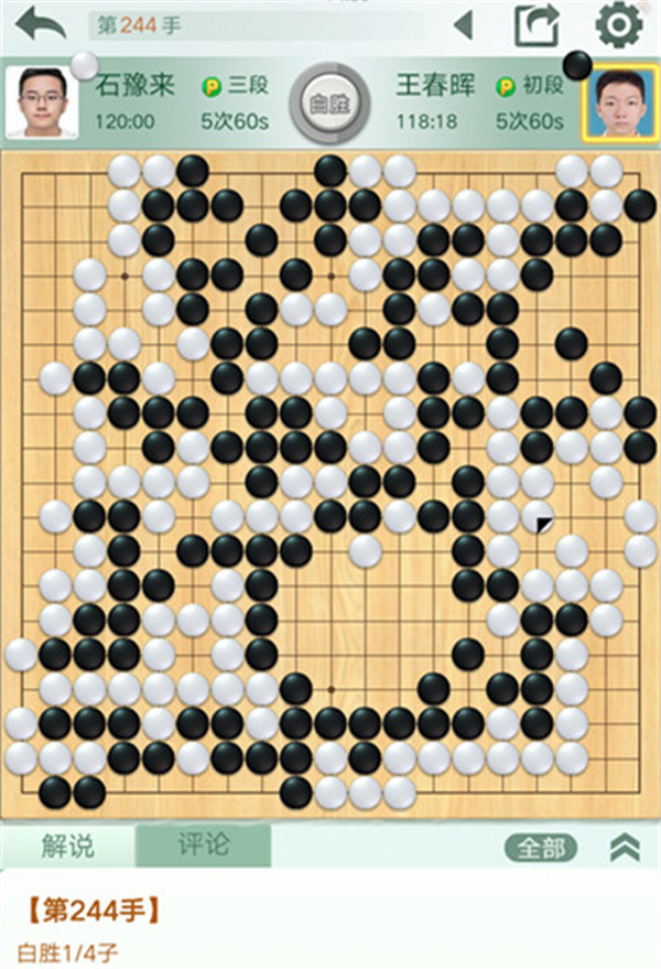 石豫來執(zhí)白對陣小將王春暉。雙方錯進(jìn)錯出,最終黑棋小官子出現(xiàn)問題,白棋幸運(yùn)1/4子獲勝。