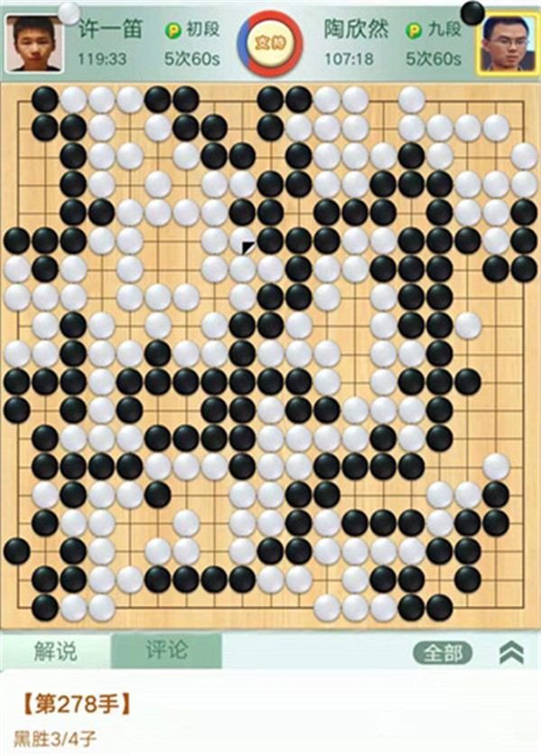 陶欣然執(zhí)黑對陣新初段許一笛。開局下邊黑棋稍虧,之后在左下角獲得便宜黑棋領(lǐng)先。大官子黑棋有所失誤局勢又是白好。之后小官子時候白棋又有失誤,黑棋幸運(yùn)的3/4子獲勝。
