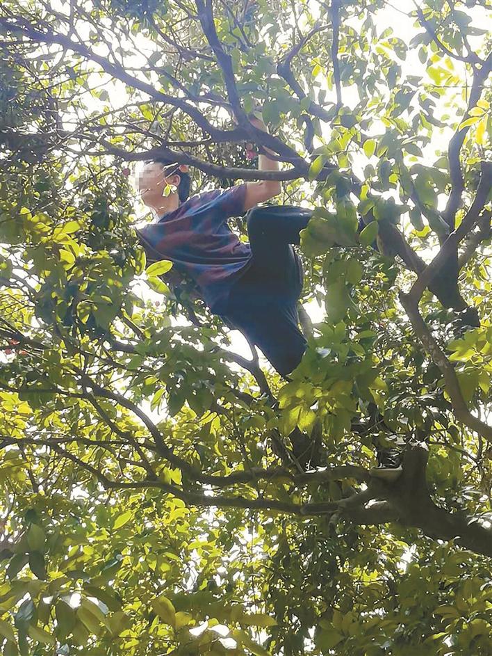 在荔枝公園,游人不顧危險(xiǎn)爬樹采摘荔枝。