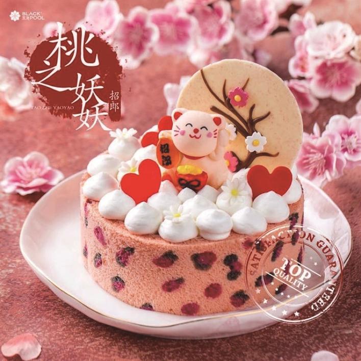 據(jù)黑池產(chǎn)品經(jīng)理介紹,“招郎蛋糕”是黑池最近重磅推出的新產(chǎn)品。蛋糕周?chē)才枳庸牲c(diǎn)綴而成的粉色豹紋,讓整個(gè)蛋糕充滿了野性魅惑又不失少女甜美。最為吸引眼球的,則是蛋糕表面,被桃花簇?fù)碇囊恢弧罢欣蛇鳌?。這只軟萌可愛(ài)的“招郎喵”,象征著,對(duì)得到這款蛋糕的人,最美好的祝愿,希望他們能夠遇到最好的愛(ài)情,找到心目中的那個(gè)他。
