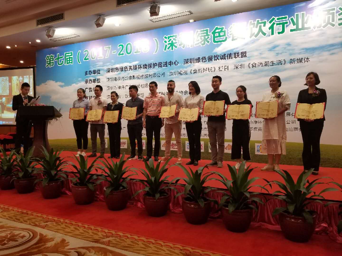 9月19日,第七屆深圳綠色餐飲行業(yè)頒獎典禮在深圳市五洲賓館舉行,共有四十家餐飲企業(yè)分別獲得深圳綠色餐飲十大特色優(yōu)秀名店獎、深圳綠色餐飲十佳綠色誠信企業(yè)獎、深圳綠色餐飲十強(qiáng)連鎖品牌企業(yè)獎、深圳綠色餐飲特受歡迎時尚餐廳獎,十位餐飲行業(yè)杰出代表獲得深圳綠色餐飲十佳人物貢獻(xiàn)獎。
