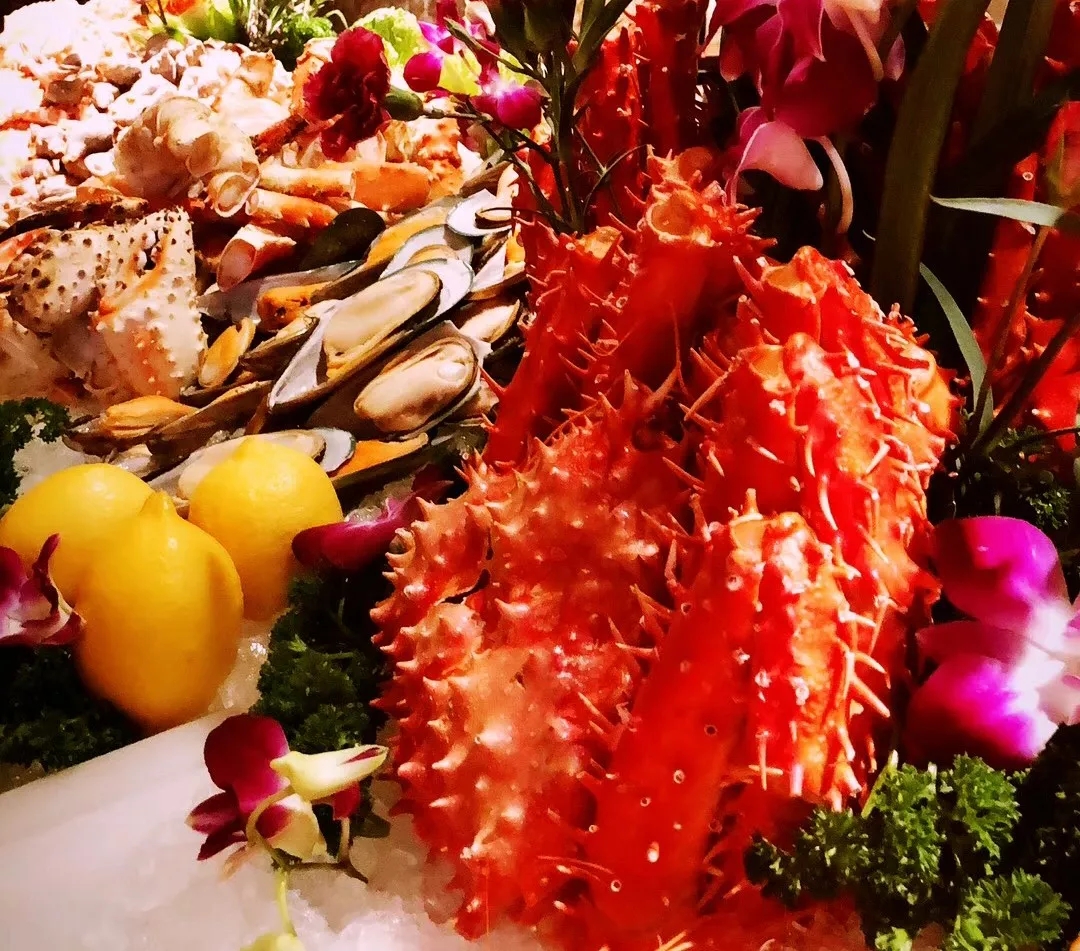 吃生猛龍蝦、阿拉斯加蟹腳、九節(jié)蝦、三文魚刺身