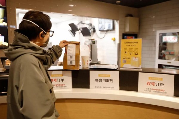 為了讓顧客放心,麥當勞在安全服務的前提下,餐廳實施“無接觸配送”和“無接觸到店取餐”。所有外送訂單均附上“麥樂送放心卡”,標注生產、配膳、外送人員姓名及體溫,做到餐品、人員可追蹤。顧客可選擇讓外送員將餐品送到指定位置取餐,在手機、餐廳自助點餐機或柜臺點餐后,無論堂食或外帶,員工都會將制作好的餐點裝入打包袋并封口,放置到取餐處。