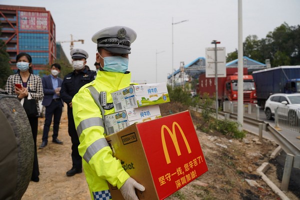 你們?cè)谝痪€戰(zhàn)疫,我們來(lái)為你補(bǔ)給!隨后,市關(guān)愛(ài)辦攜手伊利集團(tuán)、麥當(dāng)勞先后前往光明羌下公安檢查站、寶安區(qū)松安防疫檢查點(diǎn),為正在一線忙碌的工作人員,送上愛(ài)心牛奶與熱乎乎的愛(ài)心午餐?!澳銈冃量嗔恕?、“繼續(xù)加油”……每發(fā)放一次牛奶與午餐,工作人員都不忘了戰(zhàn)疫者們致敬致謝。