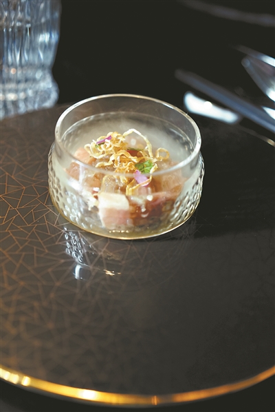 煙焯,當廚者將眼前的玻璃罩打開時,撲鼻而來的是蘋果木的煙熏香氣,閉目吸了一口氣,爾后才動勺。先將其中的金槍魚tata與炸過的洋蔥和檸檬葉絲等輕輕攪拌,然后開吃。據(jù)主理人彪哥介紹,撈起是順德魚生的吃飯演變而來,金槍魚tata是日式元素,煙熏是西餐中常用的技法。