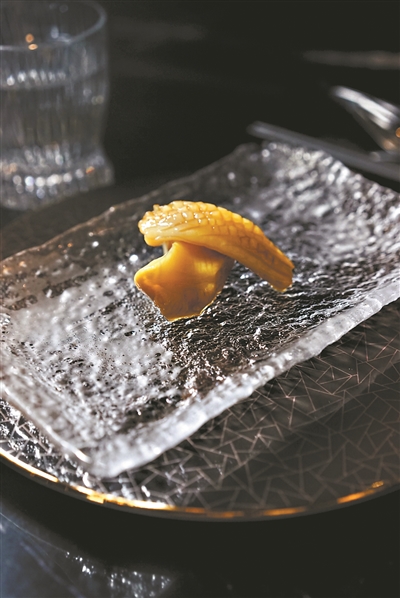 湯焯乃雞油焯響螺。1斤1只的響螺去殼與頭后,凈肉僅僅2兩。切成片狀的響螺經(jīng)過定時低溫慢煮后,淋上剛剛滾起的熱雞油,上碟時,它旁邊跟著一灘其貌不揚的醬汁,那便是紫蘇醬。響螺配紫蘇,勾起人們對中秋的紫蘇炒田螺的味覺記憶。油焯的風味靈感源自蒜香骨這道傳統(tǒng)粵菜,取蒜香味結(jié)合魚露醬,融入花膠天婦羅之中。將花膠以天婦羅的方式展現(xiàn),這也是大膽的嘗試。味焯的做法則讓人更熟悉,立馬想起前些年風靡廣州的鹵水火鍋來。獅頭鵝的鵝肝在鹵水里泡著溫泉,時間一到才起身,并不太咸,香濃恰好。還有汽焯,是用最當造的大黃花魚,將整個迷你小蒸籠搬到面前來,現(xiàn)蒸現(xiàn)吃,7分鐘,嫩度正好?;痨虅t是燒烤澳大利亞和牛肉的燒烤方式,這最原始的烹飪方式里夾著迷迭香和百里香的誘人香氣。而這每一道菜肴,僅僅數(shù)口的分量,道道位上,分量恰到好處,避免了餐桌上的浪費。