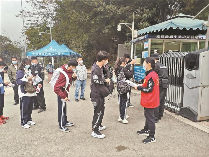 龍高黨員志愿者考前在校門口檢測(cè)學(xué)生體溫。