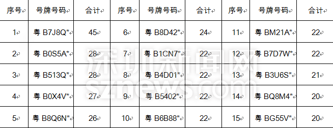 交通違法記錄大于20次的15輛車(chē)牌號(hào)碼