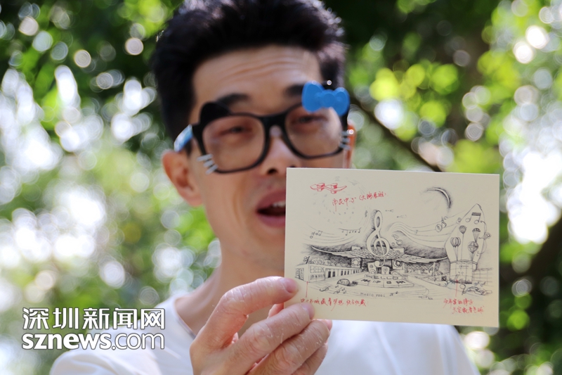 青松告訴記者,2008年剛到深圳時(shí),他就被市民中心的造型所吸引,畫下了上面這幅畫