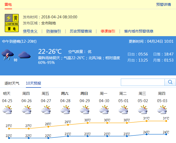 【深圳市雷電預(yù)警】深圳市氣象臺(tái)于2018年04月24日08時(shí)30分在全市陸地發(fā)布雷電預(yù)警,預(yù)計(jì)30分鐘內(nèi)全市將受雷電影響,按照防御預(yù)案停止戶外易燃易爆危險(xiǎn)作業(yè),并加強(qiáng)?;瘓鏊踩芾?。