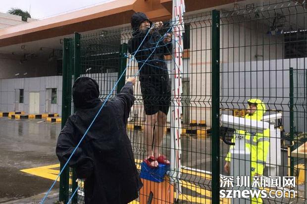 邊檢技術(shù)民警冒雨在搶修被強(qiáng)臺風(fēng)損毀的車道閘桿