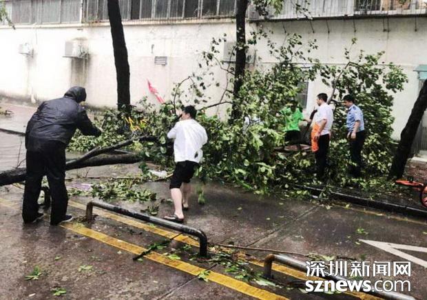 邊檢民警冒雨在執(zhí)勤現(xiàn)場搬挪被強臺風刮倒的樹枝
