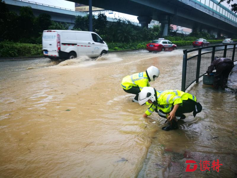 但是,眼前的情況,他們無法視而不見。深鹽二通道下方,羅沙路羅湖公安分局調頭口處,當艾力軍經(jīng)過這里時發(fā)現(xiàn)由于地勢低洼路面已經(jīng)嚴重積水,他們馬上停下車,疏通下水道。一行人在風雨中走進機動車道,沿著路邊只能用手在積水中摸索排水口的位置,將阻塞入水口的樹枝樹葉掏出來。但風急雨驟,道路積水水位剛下降一點,剛被清理的下水道又堵樹葉、樹枝等雜物堵上,他們只好不斷地進行著重復的動作。而此時,臺風“山竹”距離深圳接近130公里,羅湖片區(qū)測得最大陣風達16級。