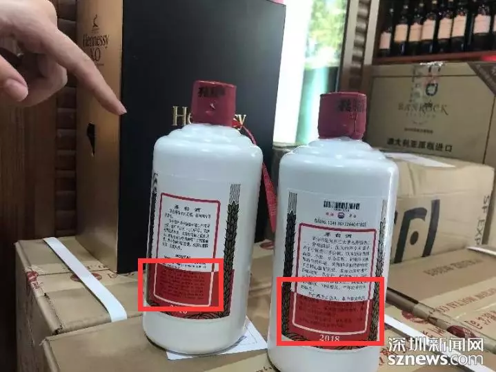 左邊為出口版茅臺(tái),有中英文標(biāo)簽,執(zhí)法人員稱不允許在國(guó)內(nèi)流通,或涉嫌走私;右邊的只有中文標(biāo)簽的,為允許在國(guó)內(nèi)流通的茅臺(tái)酒。市民朋友們購(gòu)買茅臺(tái)時(shí)需留意。