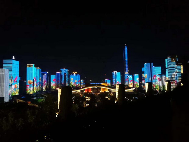 這臺(tái)別開(kāi)生面的晚會(huì),主舞臺(tái)設(shè)在市民中心廣場(chǎng),舞臺(tái)后方呈現(xiàn)著深圳市精心打造的福田中心區(qū)43座樓宇燈光秀,五彩斑斕、綺麗多姿的深圳城市新夜景,與晚會(huì)現(xiàn)場(chǎng)舞臺(tái)融為一體,為市民和廣大觀(guān)眾呈現(xiàn)出一個(gè)迷人的“深圳之夜”。